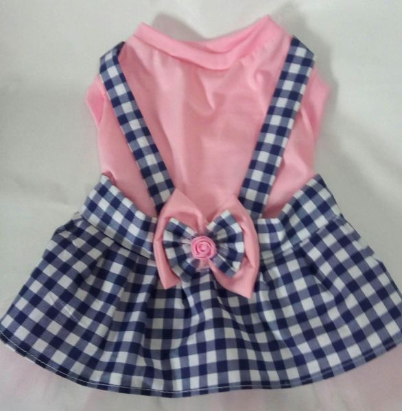 Vestido tipo jardineira, confeccionado em malha rosa de verão, no corpo, com saia e alças em tecido xadrez azul e tule rosa por baixo. Detalhe: laço rosa e azul na cintura.