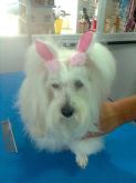 1 Enfeite Orelhas de Coelho confeccionado em feltro branco com detalhe interno da orelha rosa, pom-pom. Contém tiras em viés branco para amarrar no pescoço.